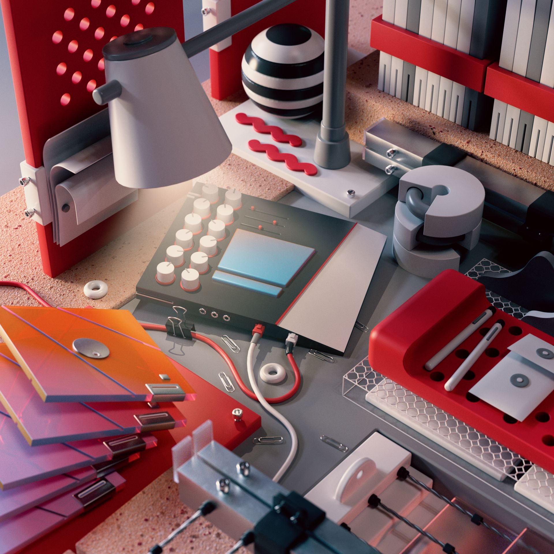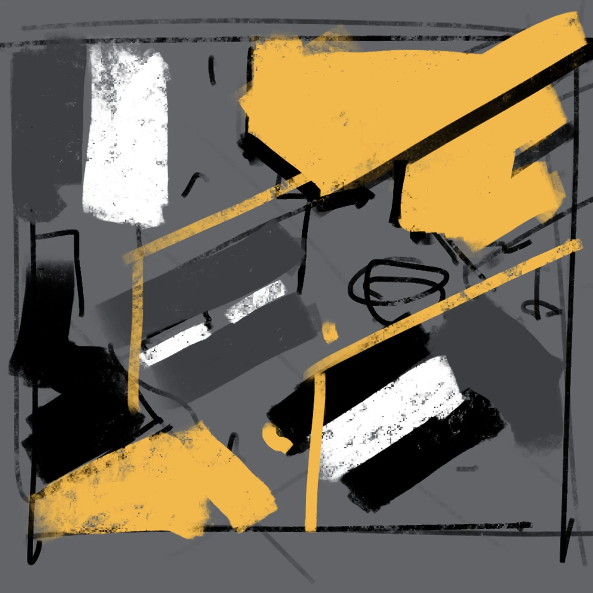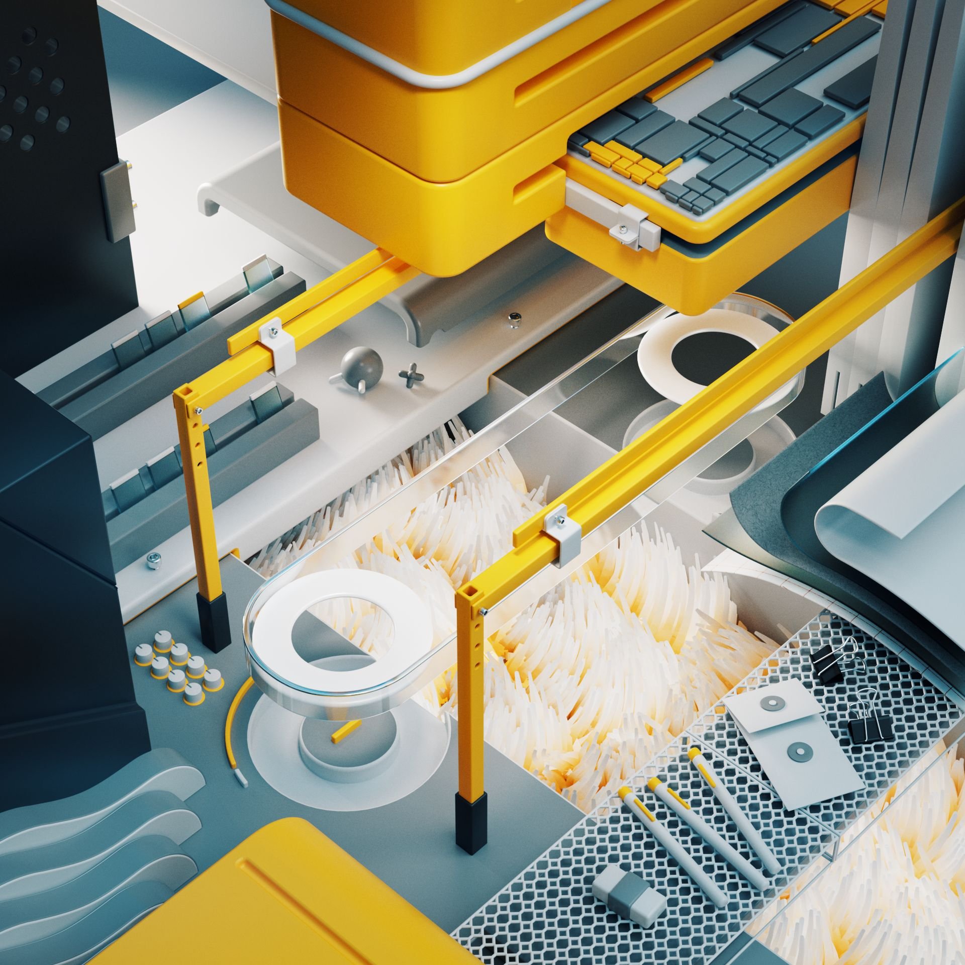 Exploring complex compositions in 3d space. A disorganized workspace helps confuse and distract.