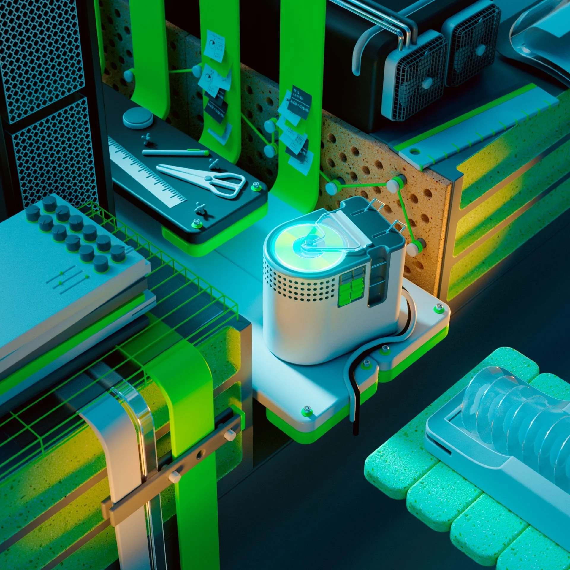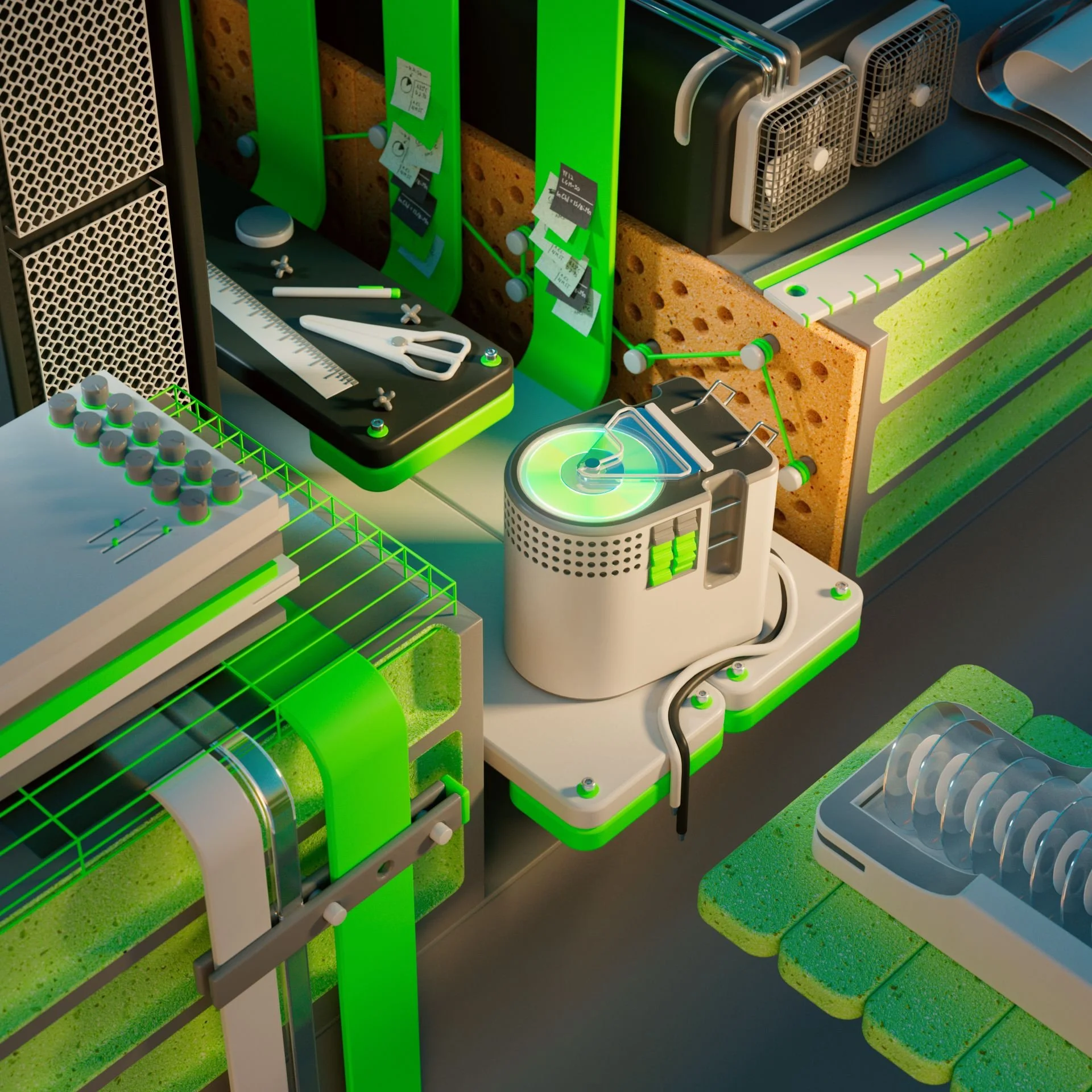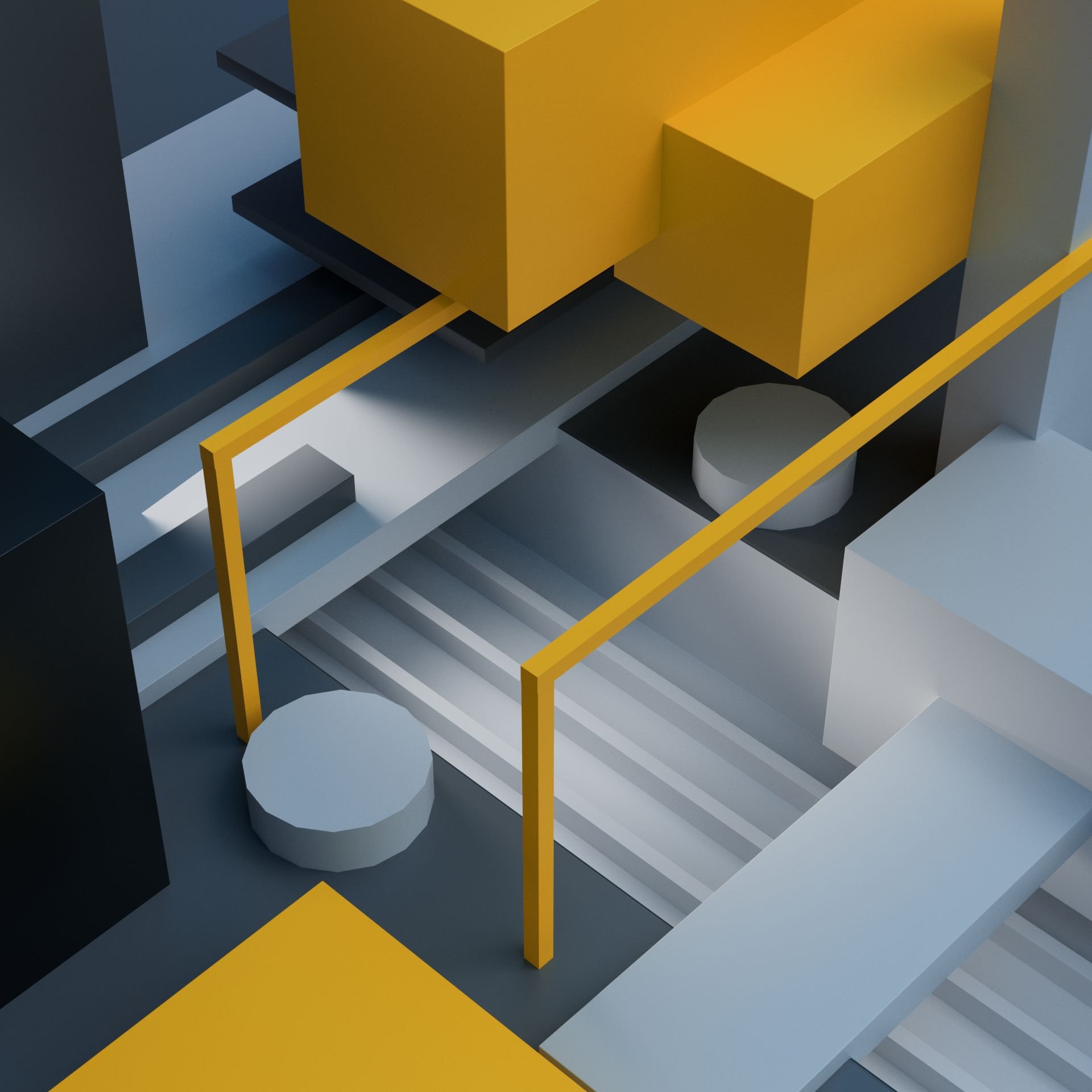 Exploring complex compositions in 3d space. A disorganized workspace helps confuse and distract.